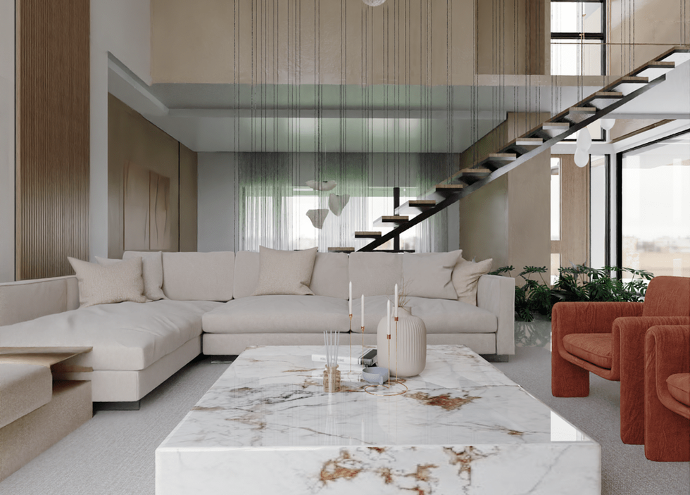 This luxurious villa in Turkey exemplifies contemporary design at its finest. The spacious living area features an expansive sectional sofa in neutral tones, offering both comfort and sophistication. A striking marble coffee table with rich, veined patterns serves as the focal point, enhancing the opulent feel of the space. The modern, floating staircase with sleek lines adds architectural interest, while the floor-to-ceiling windows flood the room with natural light. Elegant pendant lights and carefully curated decor elements, such as the candles and vases, contribute to the overall sense of luxury and refinement. The integration of warm hues and plush textures creates a harmonious and inviting environment, perfect for relaxation and socializing.